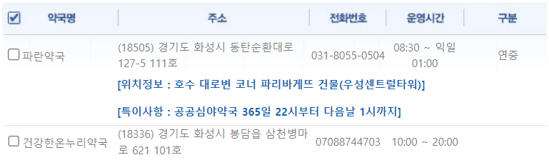 경기도 화성에 위치한 약국 중 심야약국을 운영하는 곳은 파란약국, 건강한온누리약국 2군데입니다.