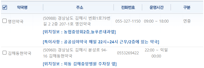 경남 김해에 위치한 약국 중 심야약국을 운영하는 곳은 명인약국, 김해동현약국으로 2곳입니다.