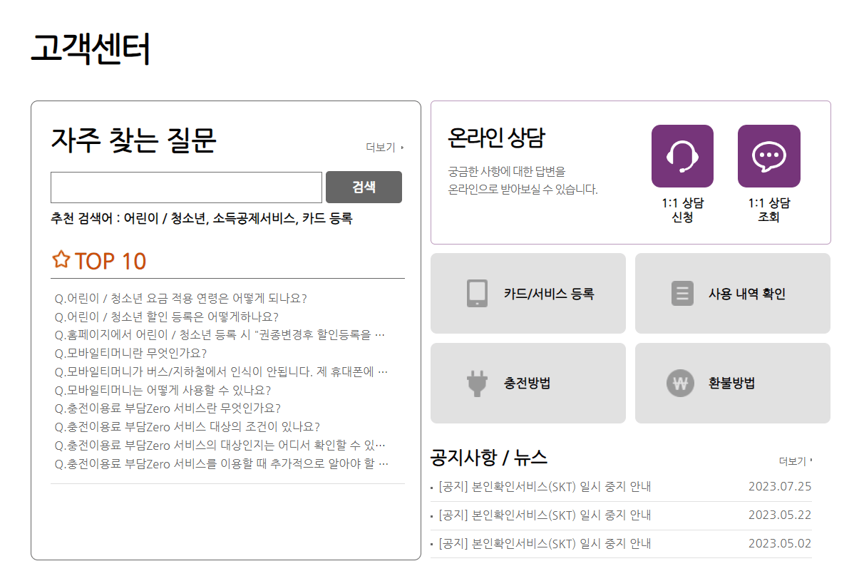 티머니 고객센터 홈페이지 이용방법